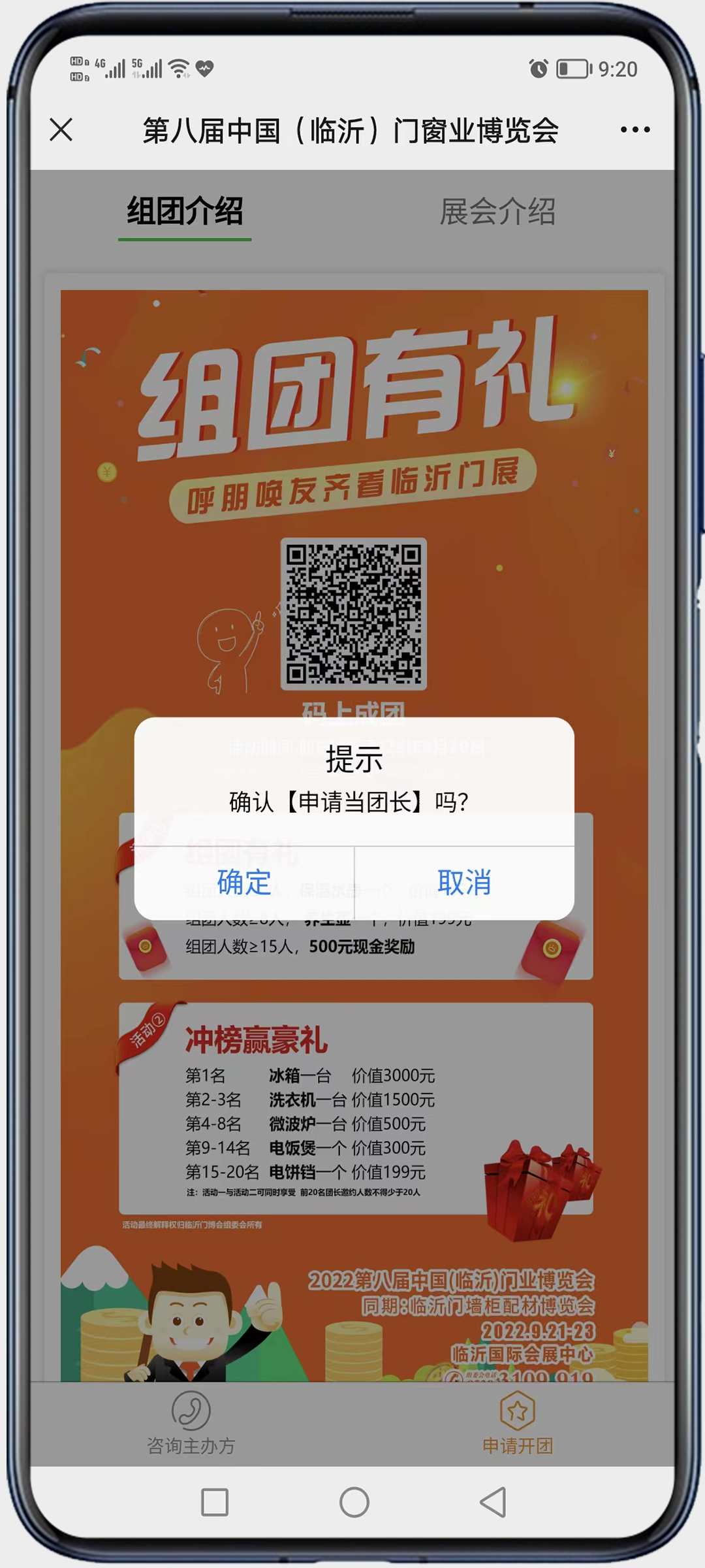 第三步:點(diǎn)擊“申請(qǐng)開團(tuán)”,確認(rèn)“申請(qǐng)當(dāng)團(tuán)長”